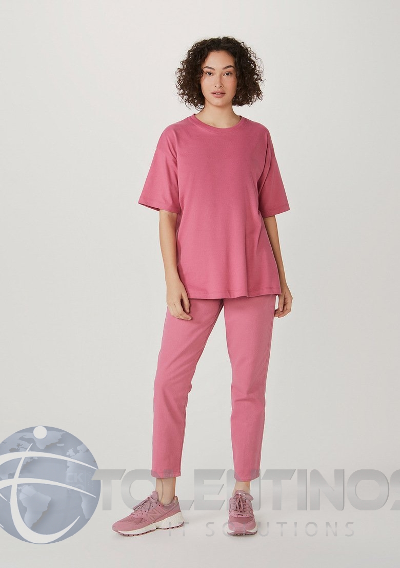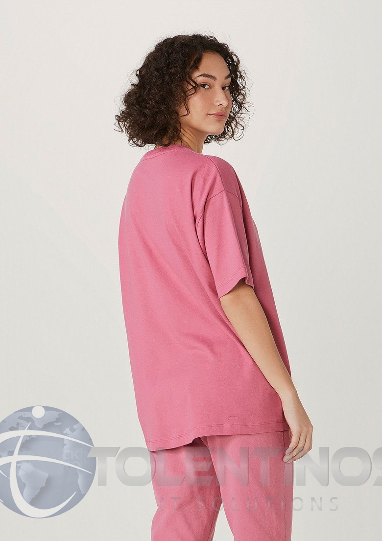 A Blusa manga curta com modelagem oversized. Seu diferencial está no decote, que assume forma mais tradicional com uma gola careca e acabamento em ribana.