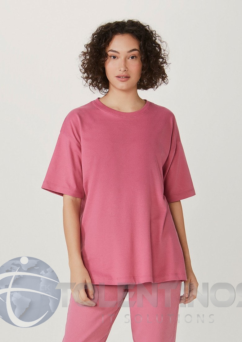 A Blusa manga curta com modelagem oversized. Seu diferencial está no decote, que assume forma mais tradicional com uma gola careca e acabamento em ribana.